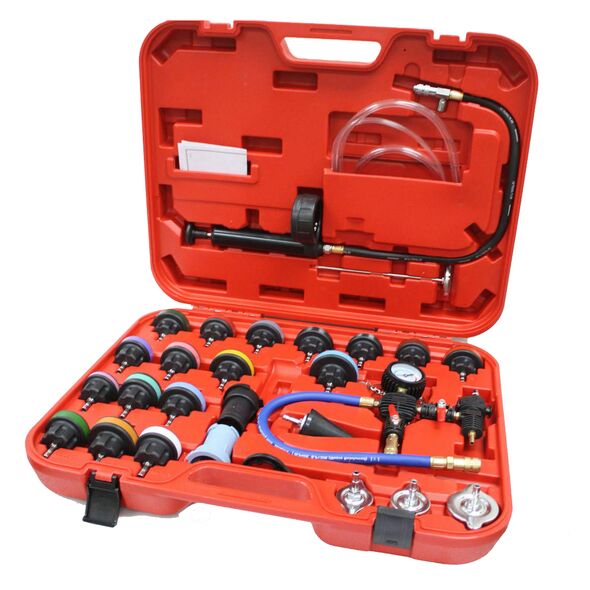 Αυτό το κιτ εργαλείων σας επιτρέπει να αλλάξετε ψυκτικό υγρό και να ελέγξετε για διαρροές στο σύστημα ψύξης του οχήματος, που περιλαμβάνει το ψυγείο, το καλοριφέρ και την τάπα του ψυγείου, με απλό και ξεκάθαρο τρόπο.