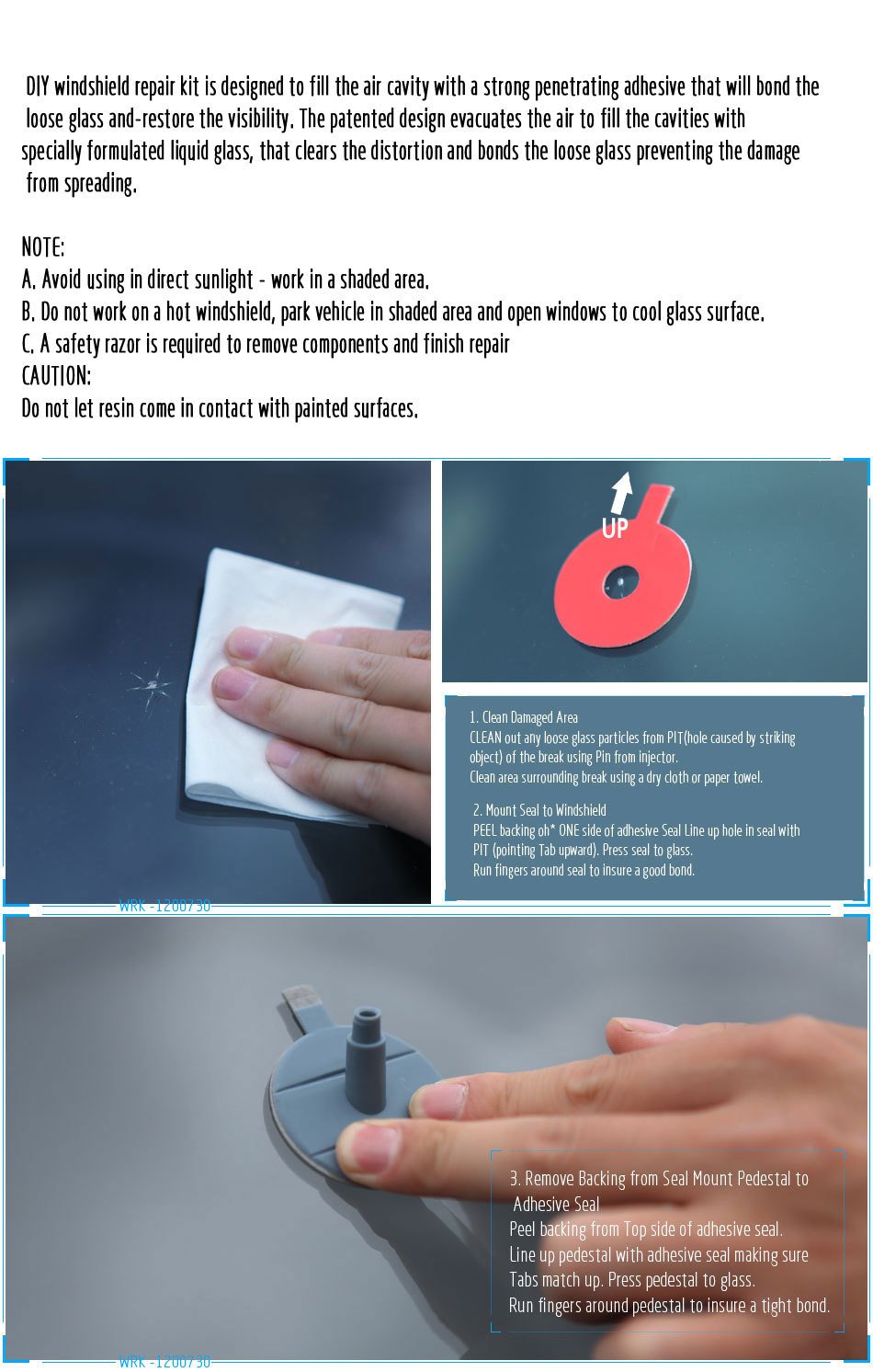 Ιδιότητες: Εύκολο στην χρήση του. Η σκλήρυνση γίνεται με το φως της ημέρας. Δεν χρειάζεται μίξη. Περιέχει όλα τα απαραίτητα για την επισκευή. Ταχεία σκλήρυνση Επισκευάζει θολώματα και ραγίσματα