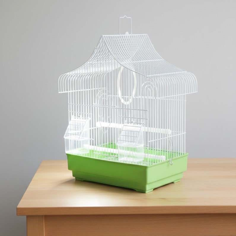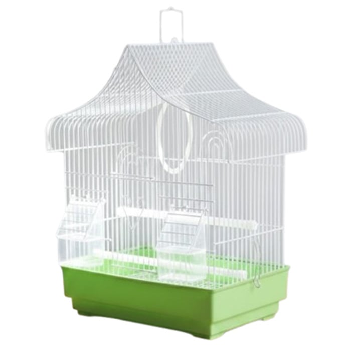 Μεταλλικό κλουβί πουλιών σε πράσινο χρώμα, ιδανικό για μικρά πτηνά. Διαθέτει αφαιρούμενη βάση για εύκολο καθαρισμό, 2 εξωτερικές ταΐστρες, πατήθρα και κρεμαστό παιχνίδι για δραστηριότητα. Πρακτική, ασφαλής και άνετη λύση για καθημερινή φιλοξενία.