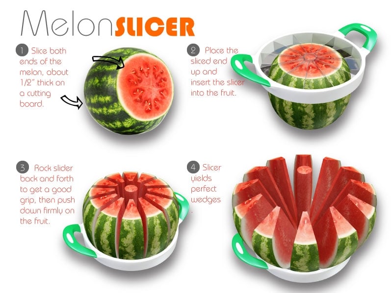 Κόψτε το φρούτο στις άκρες, τοποθετήστε πάνω τον κόφτη Melon Slicer και πιέστε. Οι φέτες είναι έτοιμες να τις σερβίρετε σε χρόνο ρεκόρ.