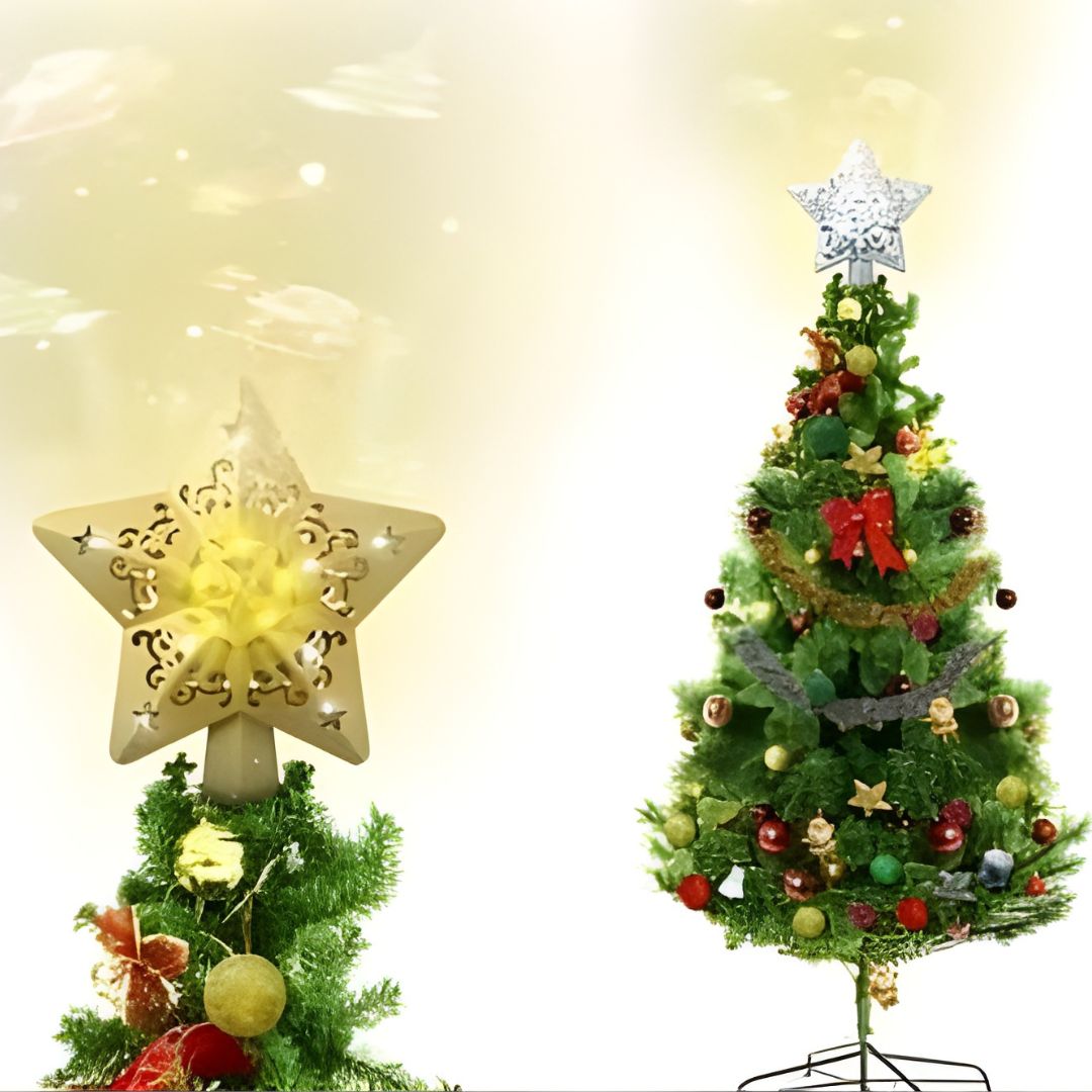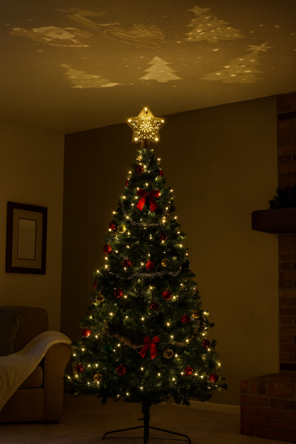 Η κορυφή-αστέρι με ενσωματωμένο προτζέκτορα συνδυάζει παραδοσιακή λάμψη με τεχνολογία φωτισμού, δημιουργώντας μια ονειρική ατμόσφαιρα στο χώρο.