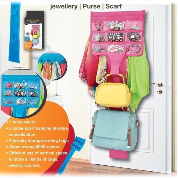 Κρεμαστή Θήκη οργάνωσης για κοσμήματα, τσάντες και φουλάρια, από πολύ ανθεκτικό υλικό, με πολλές θήκες, κρίκους και γάντζους για να βρίσκετε ότι ζητάτε με μια ματιά.
