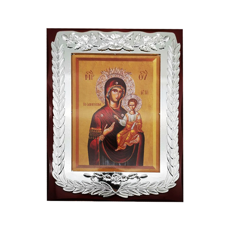 Ξύλινη Εικόνα Λουστραρισμένη που απεικονίζει την Παναγία με τον Ιησού Χριστό, για οποιονδήποτε επιθυμεί να κοσμίσει τον χώρο του με αυτή την εξαιρετική λεπτομερή εικόνα. Η εικόνα είναι διακοσμημένη με ασημένιο πλαίσιο στις άκρες της, με σχήμα ορθογώνιο.