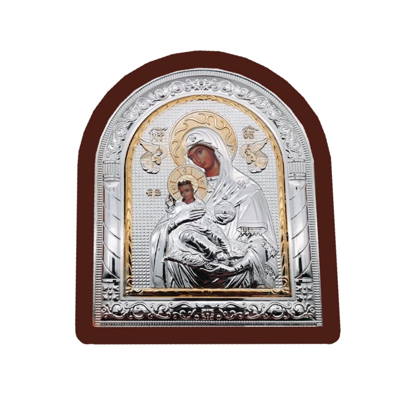 Ξύλινη Εικόνα Λουστραρισμένη που απεικονίζει την Παναγία με τον Ιησού Χριστό, για οποιονδήποτε επιθυμεί να κοσμίσει τον χώρο του με αυτή την εξαιρετική λεπτομερή εικόνα. Η εικόνα είναι διακοσμημένη με ασημένιο πλαίσιο, με σχήμα που ξεκινάει με τετράγωνη πλευρά και καταλήγει στη κορυφή ως ελλειπτική.
