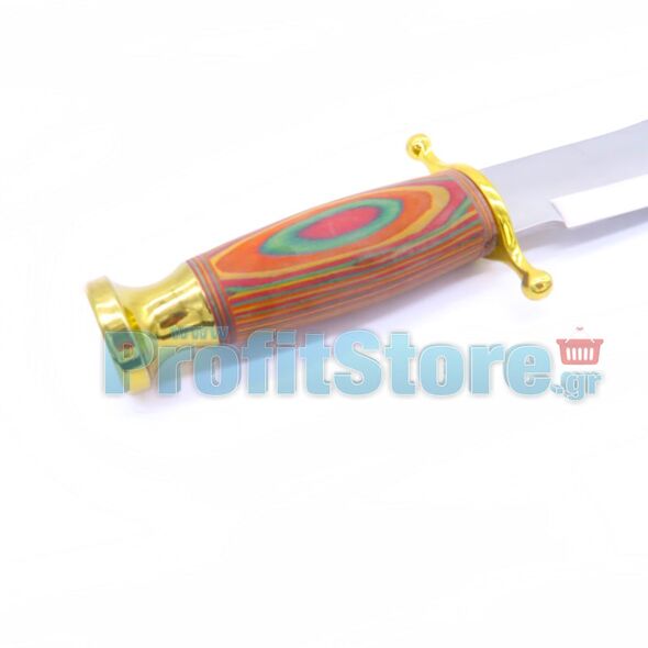 Διακοσμητικό και κυνηγετικό μαχαίρι με ξύλινη λαβή. Διαθέτει ξύλινη, κομψή, επιτραπέζια βάση για να το χρησιμοποιήσετε ως διακοσμητικό.