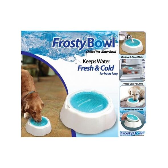 Το κύπελλο-καταψύκτης FrostyBowl είναι η τέλεια λύση για την παροχή κρύου νερού. Διατηρεί τη χαμηλή θερμοκρασία για περίπου 8 ώρες. Το μόνο που έχετε να κάνετε είναι να παγώσετε την βάση με το ειδικό gel για περίπου 2-3 ώρες, στον καταψύκτη. Στη συνέχεια, τοποθετήστε στην βάση του το μπολ και γεμίστε το με δροσερό κρύο νερό. Έτσι το νερό στη ποτίστρα θα παραμείνει κρύο για περίπου 8 ώρες.