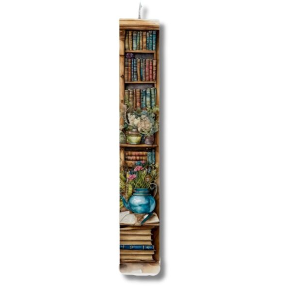 Η πλακέ αυτή λαμπάδα ξεχωρίζει με την εκτύπωση υψηλής ποιότητας σε σχέδιο vintage βιβλιοθήκης, όπου ξύλινα ράφια, παλαιωμένα βιβλία και λουλούδια συνθέτουν μια ζεστή, ρομαντική εικόνα.