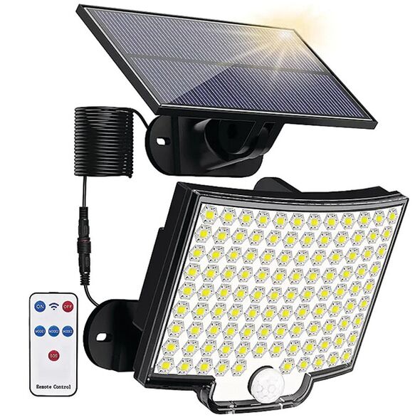 LED Αδιάβροχο Ηλιακό Επαναφορτιζόμενο Επιτοίχιο Φωτιστικό με Πάνελ 108 SMD, Αισθητήρα Κίνησης, Τηλεχειριστήριο και Ψυχρό Λευκό Φωτισμό Μαύρο