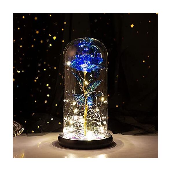 Διακοσμητικό φωτιστικό LED με μπλε τριαντάφυλλο σε γυάλινο βάζο.