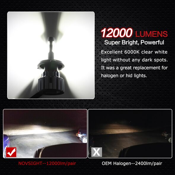 Φωτίστε το δρόμο σας περισσότερο εγκαθιστώντας ένα CREE LED kit H4 / 6000Κ υψηλής ποιότητας NovSight, με απίστευτη κατανομή φωτός 360ᵒ, κατανάλωση μόλις 70W και εξαιρετικά μεγάλη συνολική φωτεινότητα 12000LM (2x6000Lm). Σετ H4 με δύο σκάλες φωτισμού (High, Low).