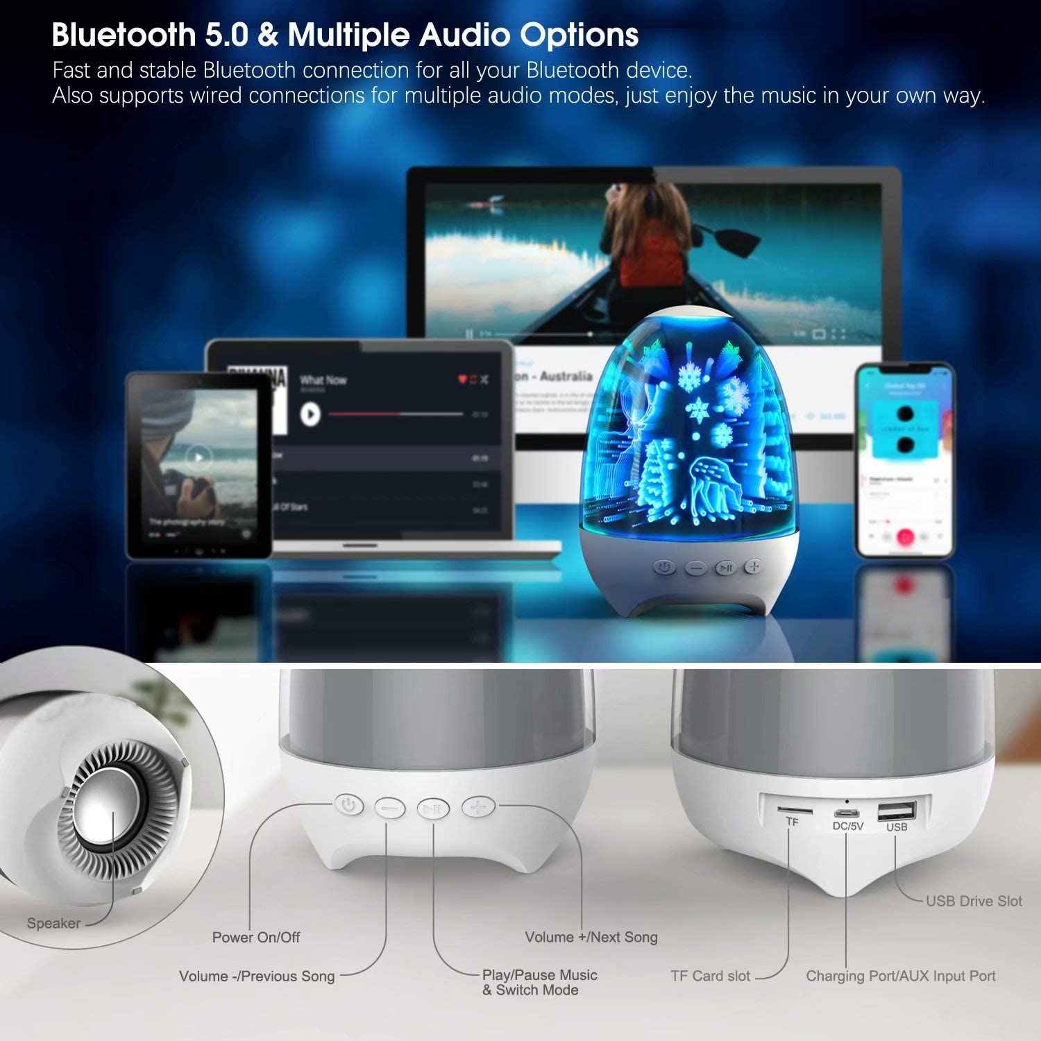 Πανέμορφο χριστουγεννιάτικο LED φωτιστικό με λειτουργία αφής και ενσωματωμένο Bluetooth για να συνδέσετε την αγαπημένη σας συσκευή και να ακούτε ατελείωτες ώρες μουσικής! Ένα εξαιρετικής ποιότητας Bluetooth multimedia ηχείο με πολλές λειτουργίες.