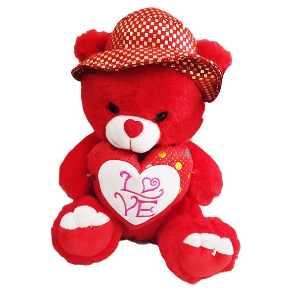 Ένα αρκουδάκι κόκκινου χρώματος, στο στηθος του έχει μία μία καρδιά, όπου πάνω της αναγράφεται η λέξη "Love" και φοράει ενα πανέμορφο καπέλο.