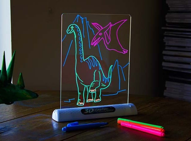 Περιεχόμενα συσκευασίας: 1 διάφανος πίνακας, βάση LED, 4 φωσφοριζέ μαρκαδόροι, γυαλιά 3D, σχέδια ζωγραφικής.