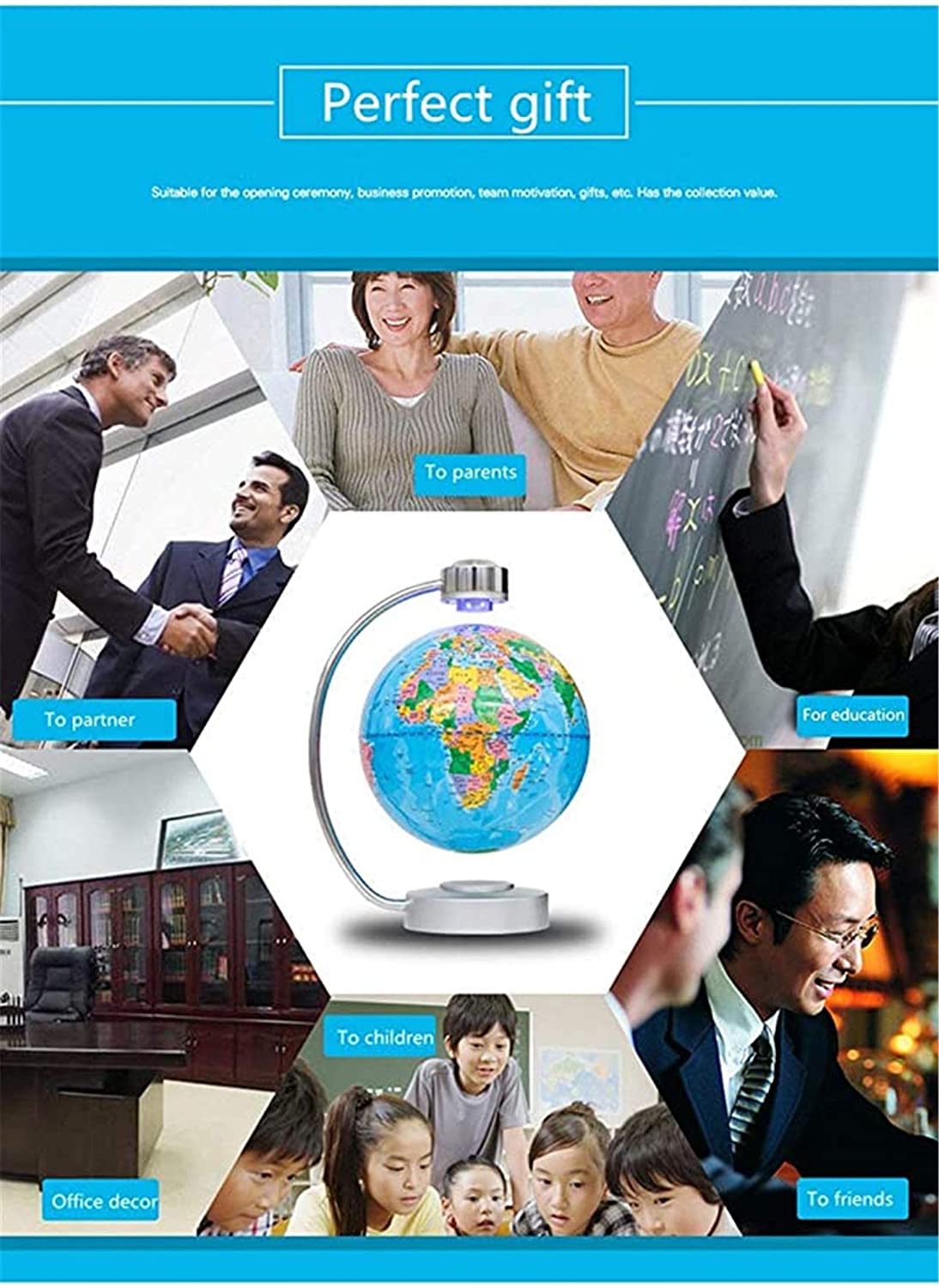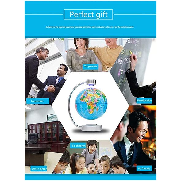 Ένα μοναδικό ιδανικό δώρο για όλους που θα προσφέρει γνώση χαρά και θα εντυπωσιάσει μικρούς και μεγάλους ενώ ταυτόχρονα θα διακοσμήσει με ξεχωριστό τρόπο το γραφείο, το σπίτι και την βιβλιοθήκη σας. Απλώς τοποθετείτε την βάση στο γραφείο, τοποθετείτε την υδρόγειο στην βάση με το χέρι και η υδρόγειος θα αρχίσει να περιστρέφετε αιωρούμενη !