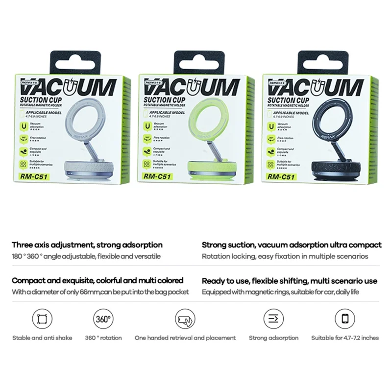 Η ισχυρή βεντούζα κενού εξασφαλίζει σταθερή εφαρμογή σε διάφορες επιφάνειες, ενώ ο μαγνητικός μηχανισμός κάνει την τοποθέτηση της συσκευής γρήγορη και εύκολη.
