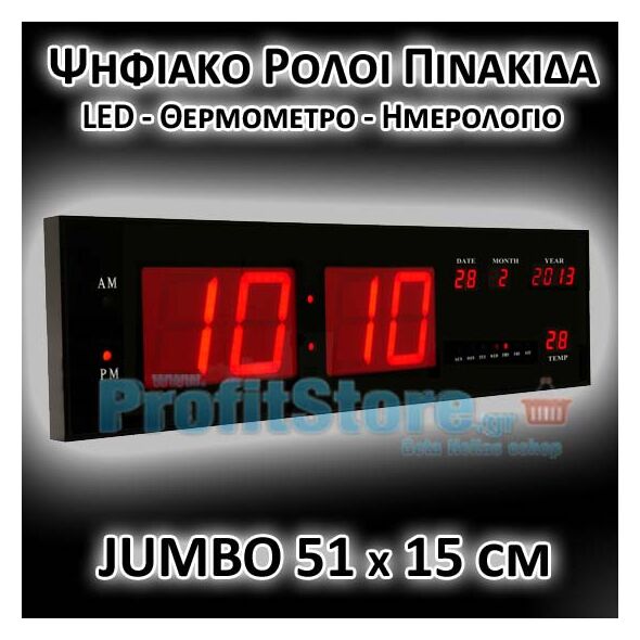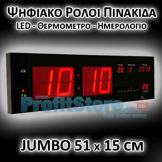 Μεγάλο Ψηφιακό Ρολόι Τοίχου - Πινακίδα LED με Θερμόμετρο και Ημερολόγιο - Jumbo Clock