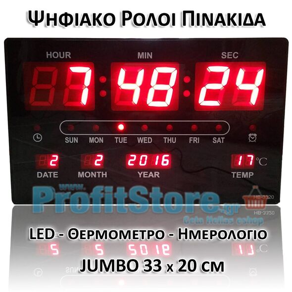 Μεγάλο Ψηφιακό Ρολόι - Πινακίδα LED με Θερμόμετρο και Ημερολόγιο HB-3320