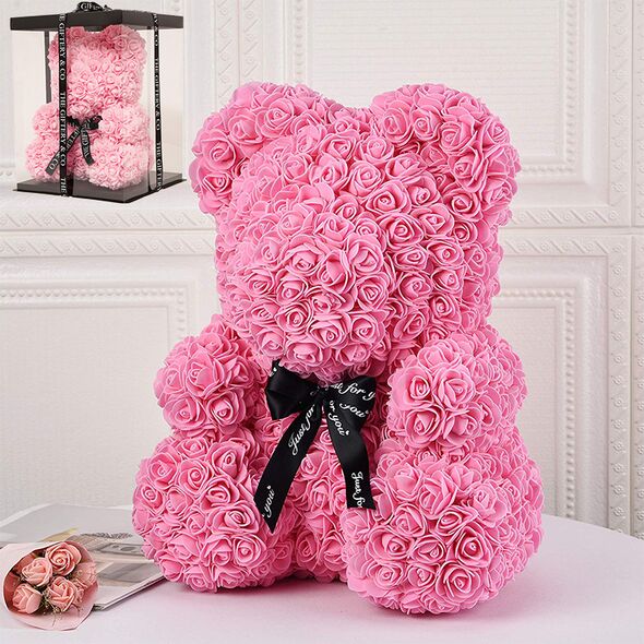 Μεγάλο Τριανταφυλλένιο Αρκουδάκι με Φιόγκο 40cm Σε Συσκευασία Δώρου - Δώρο για Άγιο Βαλεντίνο - Τεχνητά Ροδοπέταλα Τριαντάφυλλα Ροζ