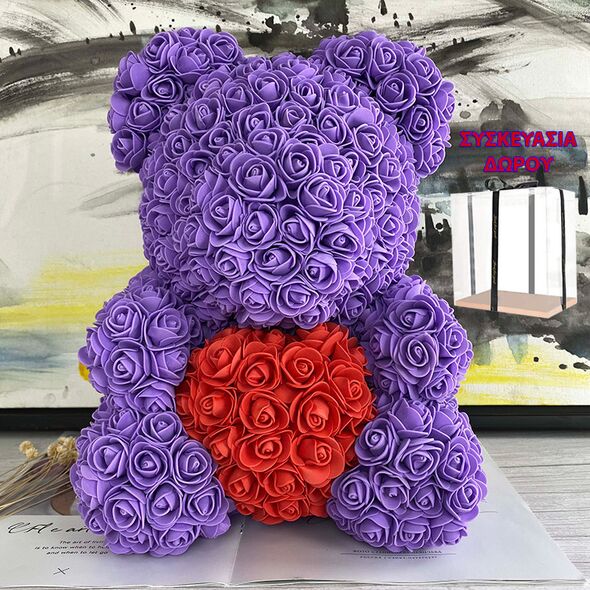 Μεγάλο Τριανταφυλλένιο Αρκουδάκι με Καρδούλα 40cm Σε Συσκευασία Δώρου - Δώρο για Άγιο Βαλεντίνο - Τεχνητά Ροδοπέταλα Τριαντάφυλλα Μωβ
