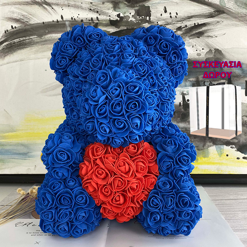 Μεγάλο Τριανταφυλλένιο Αρκουδάκι με Καρδούλα 40cm Σε Συσκευασία Δώρου - Δώρο για Άγιο Βαλεντίνο - Τεχνητά Ροδοπέταλα Τριαντάφυλλα Μπλε