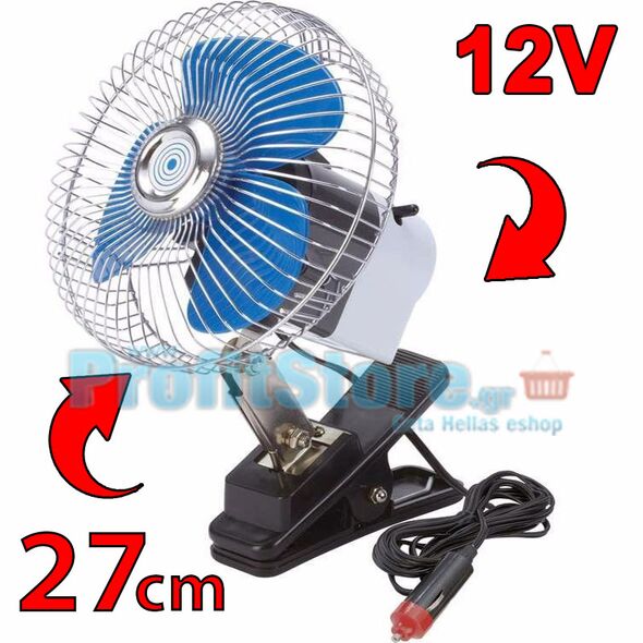Μεγάλος Ισχυρός Περιστρεφόμενος Ανεμιστήρας Αυτοκινήτου 27εκ 25W με Κλιπ - Μανταλάκι Στήριξης