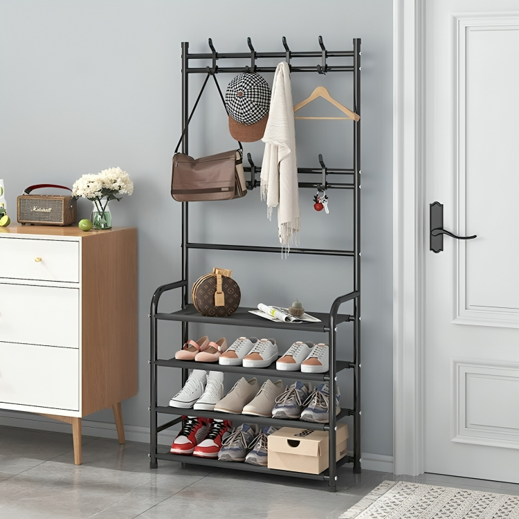 Μεταλλική Ραφιέρα Παπουτσοθήκη 172x57x62 4 Επιπέδων & Κρεμάστρα Εισόδου, Μπάνιου, για Παλτά, Μπουφάν & Καπέλα Έπιπλο Εισόδου - Μαύρο