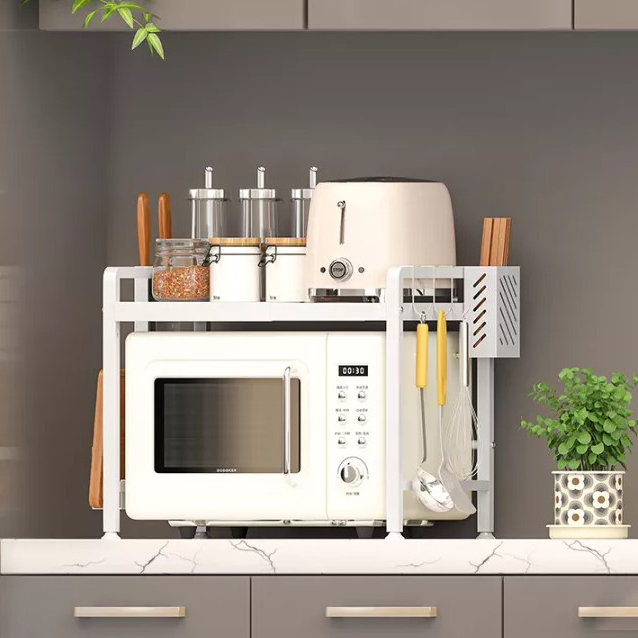 Μεταλλική Ρυθμιζόμενη Ραφιέρα Αποθήκευσης για Κουζίνα - Φούρνο Μικροκύμάτων με Γαντζάκια - Microwave Oven Adjustable Storage Rack Λευκό