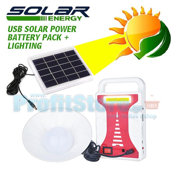 Πλήρες ηλιακό πακέτο φωτισμού και φόρτισης PowerBank μικρών διαστάσεων με ηλιακό panel, μπαταρία με φωτιστικό LED, ισχυρή λάμπα led 200LM και θύρα usb για φόρτιση πολλών διαφορετικών συσκευών και κινητών τηλεφώνων..