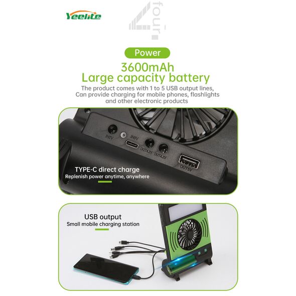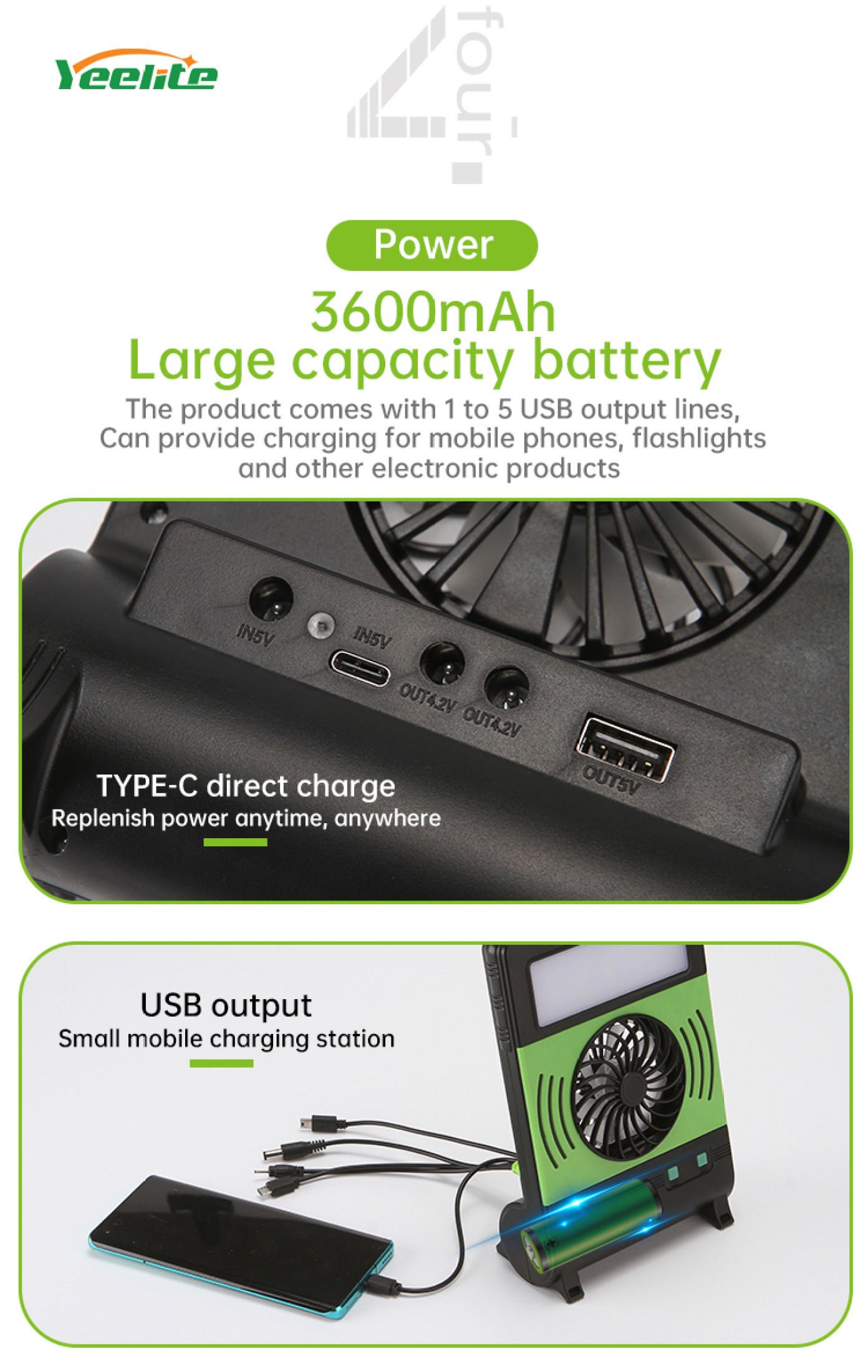 Πλήρες ηλιακό πακέτο φωτισμού και φόρτισης PowerBank μικρών διαστάσεων με ηλιακό panel, μπαταρία μεγάλης χωρητικότητας 3600 mAh, φωτιστικό LED, ανεμιστήρα 3 ταχυτήτων και θύρα usb για φόρτιση πολλών διαφορετικών συσκευών και κινητών τηλεφώνων.