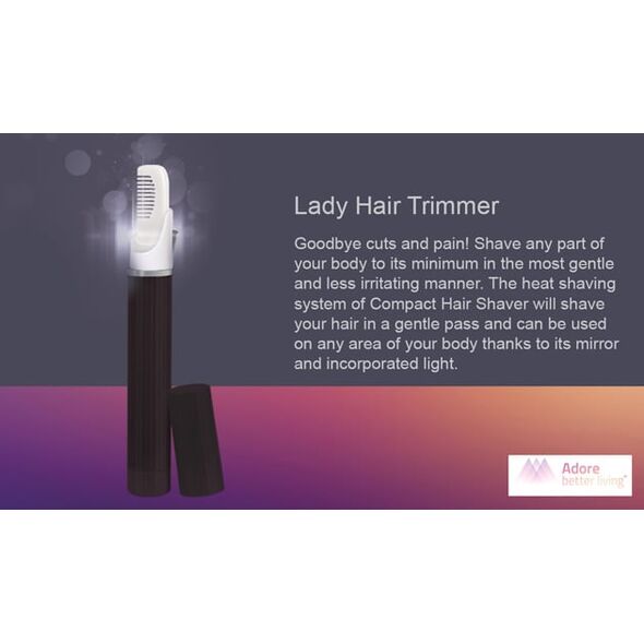 Το Adore Compact Hair Trimmer είναι ένα mini φορητό σύστημα για την ελάττωση της πυκνότητας της τριχοφυΐας στις δύσκολες περιοχές. Με την ολοκλήρωση της θεραπείας εξαφανίζεται το 80% των τριχών ενώ αδυνατίζουν οι υπόλοιπες. Τα αποτελέσματα είναι ορατά από τους πρώτους μήνες χρήσης.