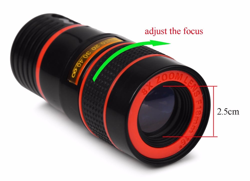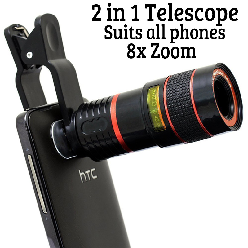 Το mini μονόκυαλο 8X είναι, παρά το μέγεθός του, ένα ισχυρότατα τηλεσκόπιο 8x Zoom(!) - οπτικός τηλεφακός, το οποίο μπορεί να χρησιμοποιηθεί 1) είτε σαν ένα κλασικό μονόκυαλο, 2) είτε να τοποθετηθεί (με ειδικό κλιπ) μπροστά από την κάμερα του κινητού σας τηλεφώνου!