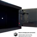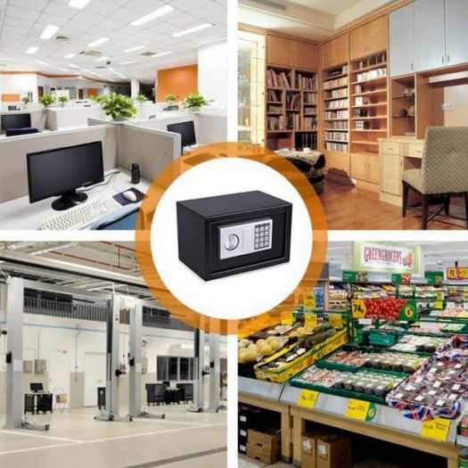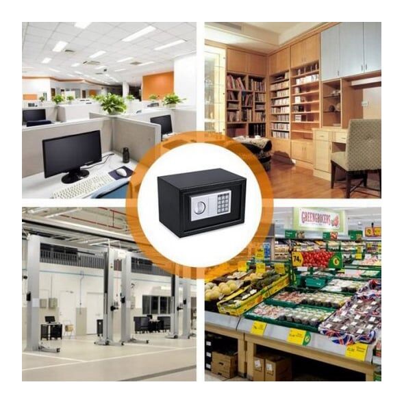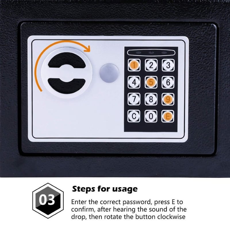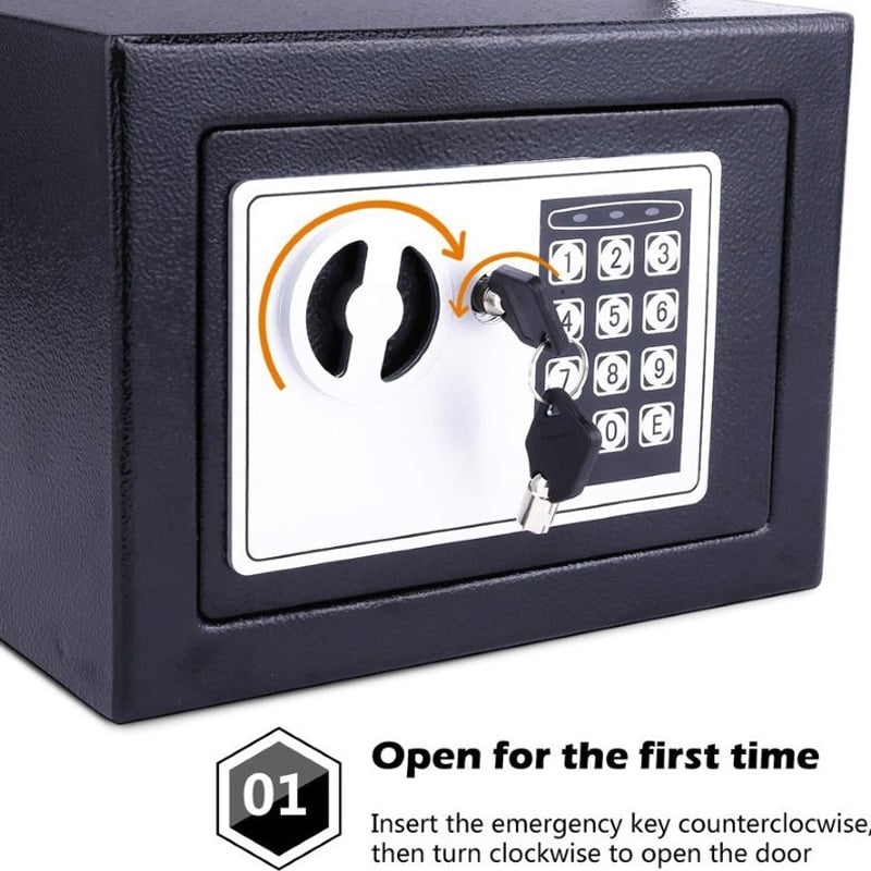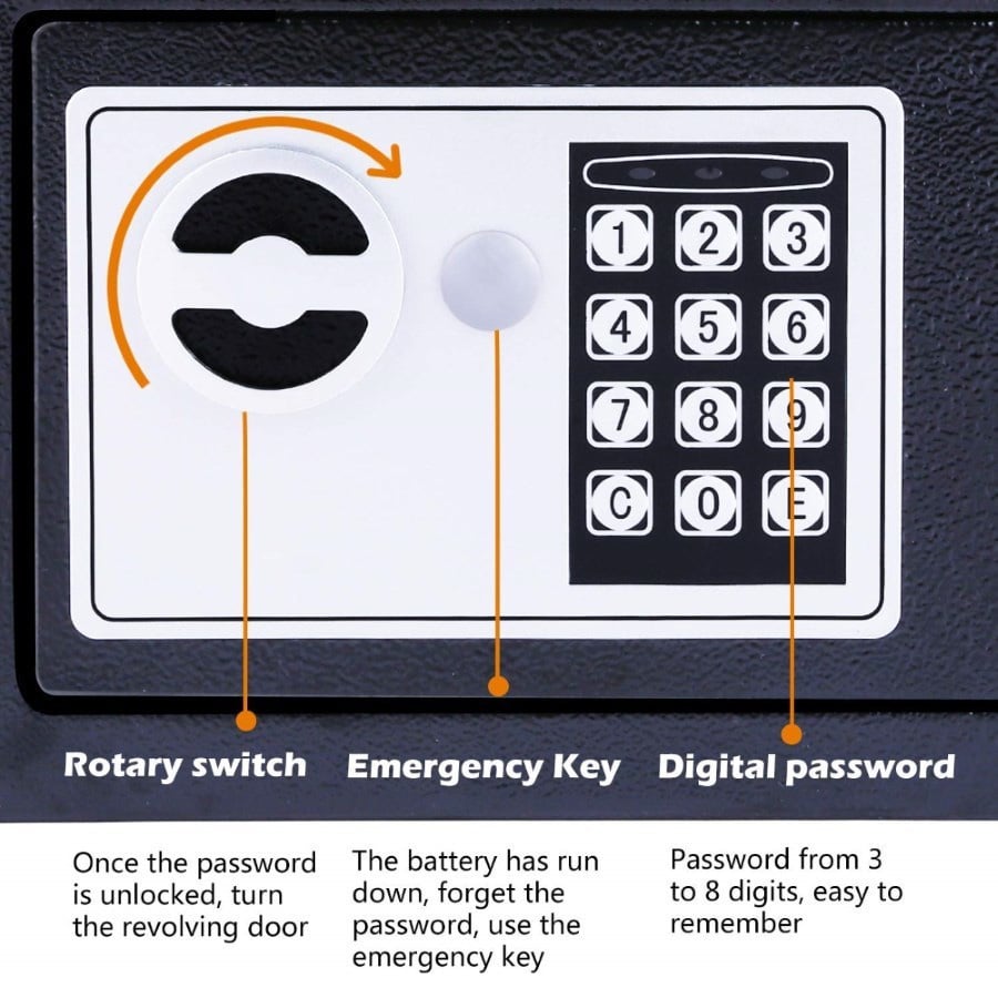 Διαθέτει προγραμματιζόμενη ψηφιακή κλειδαριά 3-8 ψηφίων, που σας επιτρέπει να επιλέγετε τον συνδυασμό που επιθυμείτε και κλειδαριά ασφαλείας με 2 κλειδιά που ανοίγουν το χρηματοκιβώτιο σε περίπτωση ανάγκης.