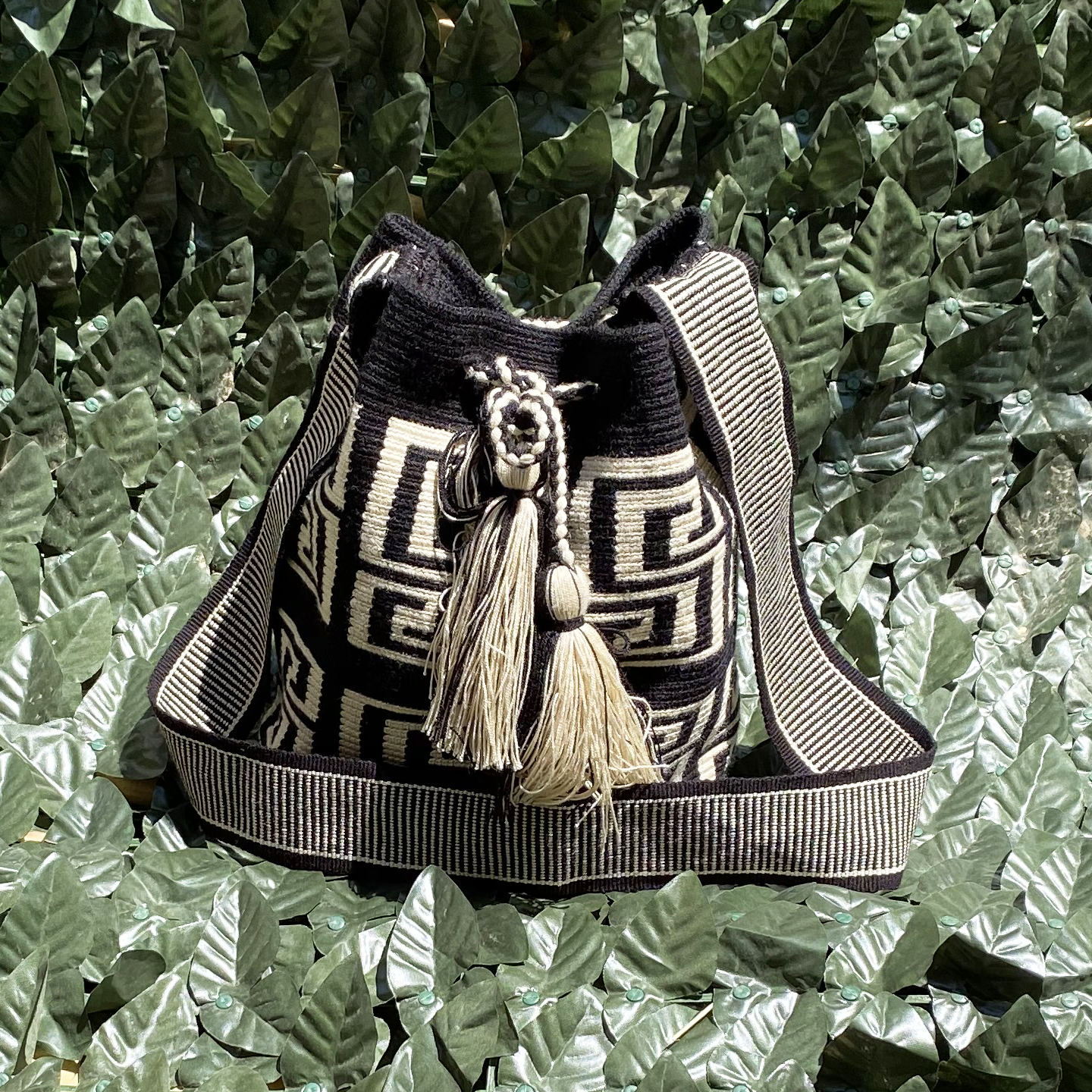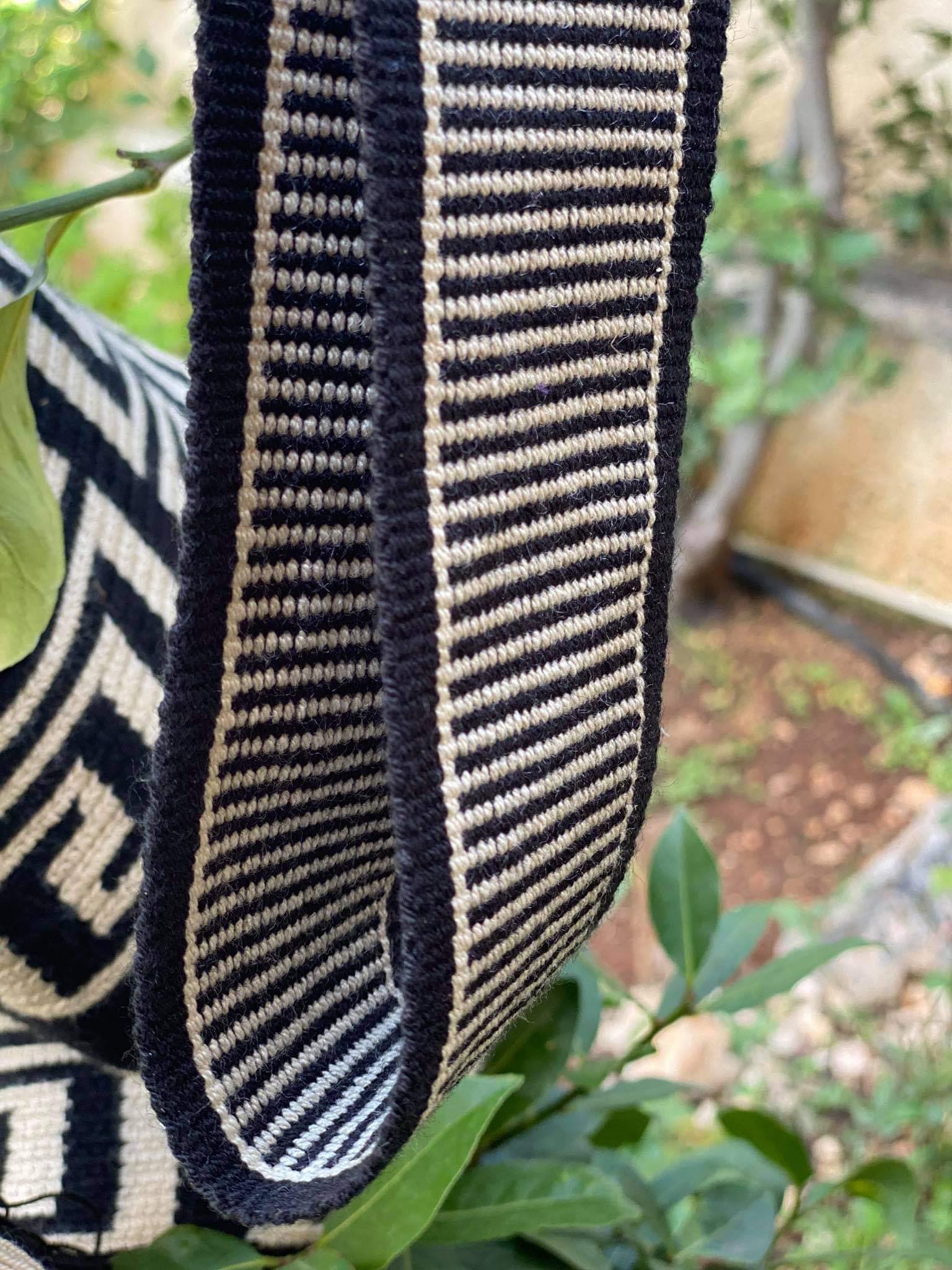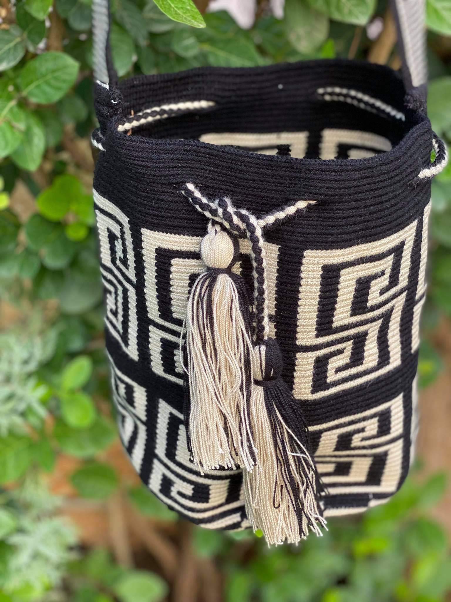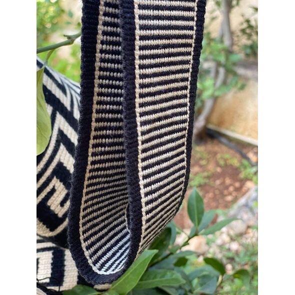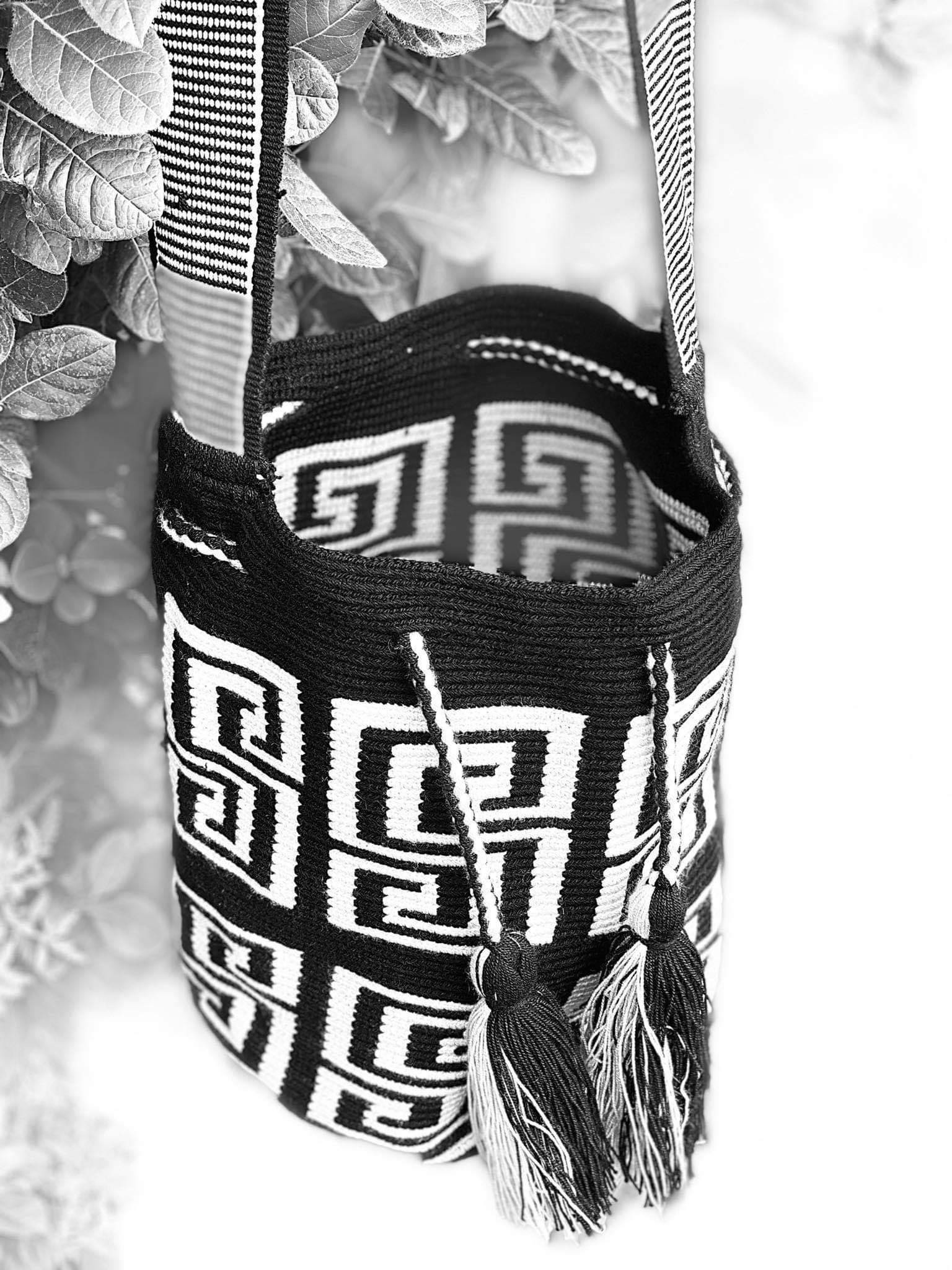 Μία και μοναδική wayuu mochila πλεγμένη με ντόπιες κλωστές και ζωηρά χρώματα από την αυθεντική κουλτούρα των Κολομβιανών εκτάσεων. Η συγκεκριμένη wayuu mochila διατίθεται μαύρο με λευκά αρχαιοελληνικά λευκά σχέδια. Διαλέξτε τη δική σας. Τη ΜΟΝΑΔΙΚΗ δική σας!