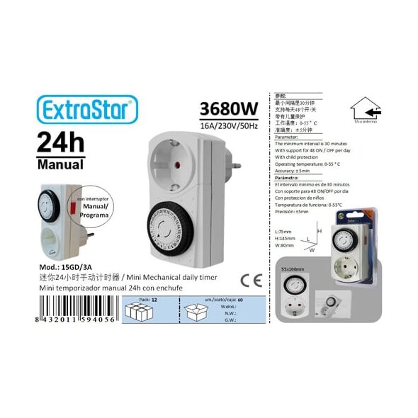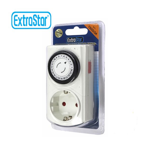 Μονή πρίζα ExtraStar με προγραμματιζόμενο χρονόμετρο 24 ωρών. Μια πολύ χρήσιμη συσκευή, που εξυπηρετεί στο να ελέγχετε την κατανάλωση της ηλεκτρικής σας ενέργειας, είτε βρίσκεστε στο σπίτι σας, είτε λείπετε σε διακοπές!