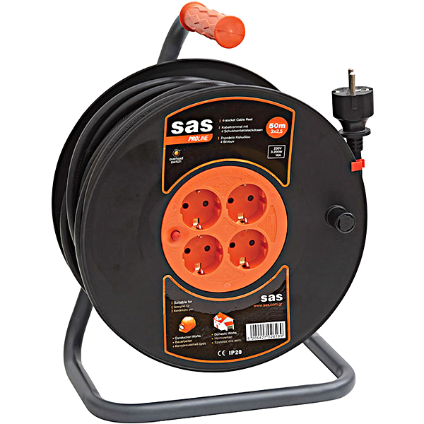 Μπαλαντέζα Στροφείο Καλωδίου - Καρέ Καλωδίου 3x1.5mm² Μήκος Καλωδίου 50m SAS 100-12-005 Διαθέτει 4 υποδοχές σούκο. Διαθέτει διακόπτη υπερφόρτωσης, προστατεύοντας τις ηλεκτρικές συσκευές από ενδεχόμενη βλάβη που μπορεί να προκληθεί από υπερφόρτωση. Ενισχυμένη μεταλλική πρακτική βάση στήριξης.