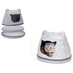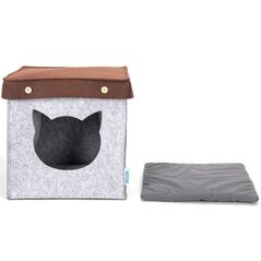 Σπιτάκι γάτας από τσόχα σε γκρι και καφέ απόχρωση, με μαλακό μαξιλάρι και εύκολη συναρμολόγηση. Προσφέρει άνετο και προστατευμένο χώρο ξεκούρασης για καθημερινή χρήση στο σπίτι.