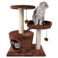 Γατόδεντρο 2 επιπέδων με ονυχοδρόμιο από σιζάλ, σπιτάκι και κρεμαστά παιχνίδια. Σταθερή κατασκευή από MDF, ιδανικό για γατάκια και γάτες εσωτερικού χώρου. Διαστάσεις 49 x 35 x 60 cm.