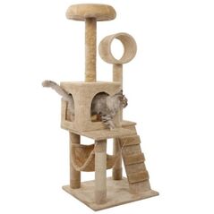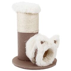 Πρακτικό και κομψό δέντρο για γάτες με φωλιά, ονυχοδρόμιο και πλατφόρμα, σε μπεζ χρώμα. Διαστάσεις 30x30x60 cm – ιδανικό για μικρούς χώρους και γατάκια που αγαπούν το παιχνίδι και την ξεκούραση.