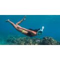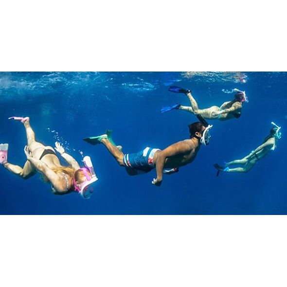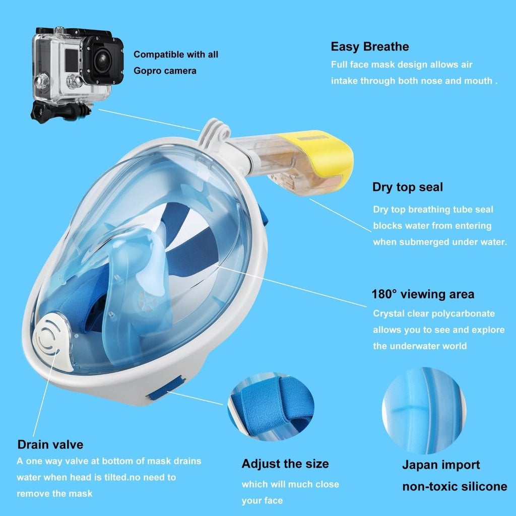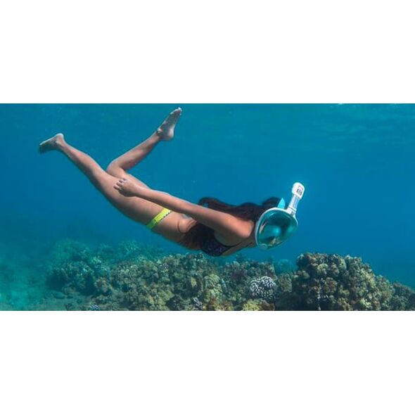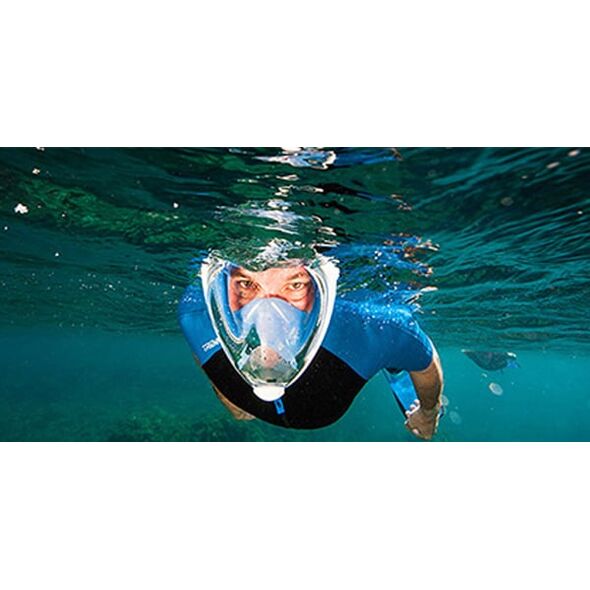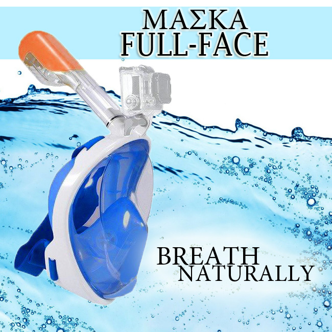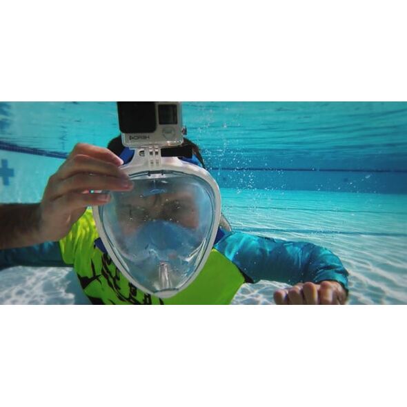 Ολοπρόσωπη μάσκα με αναπνευστήρα και βάση για action cameras, κατάλληλη για snorkeling στην θάλασσα. Διαθέτει βαλβίδες αντιθαμβωτικές και εξαγωγής του νερού, όπως επίσης και σύστημα κατά της εισροής υδάτων στον αναπνευστήρα.