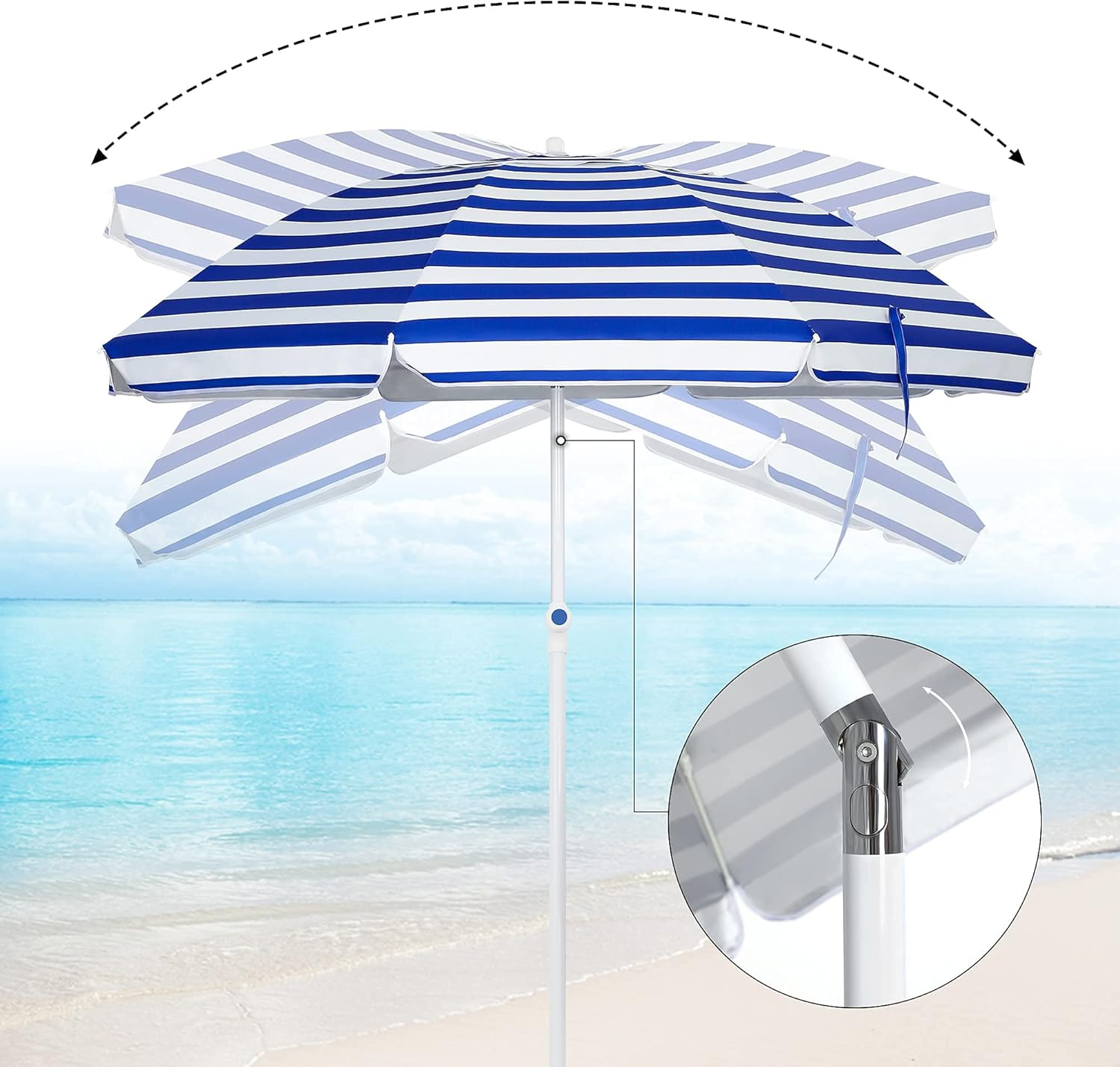 Με ρύθμιση κλίσης για βέλτιστη σκίαση: Ρυθμίστε εύκολα τη θέση σκίασης χάρη στη λειτουργία κλίσης, προσαρμόζοντας την ομπρέλα ανάλογα με τη θέση του ήλιου μέσα στη μέρα.