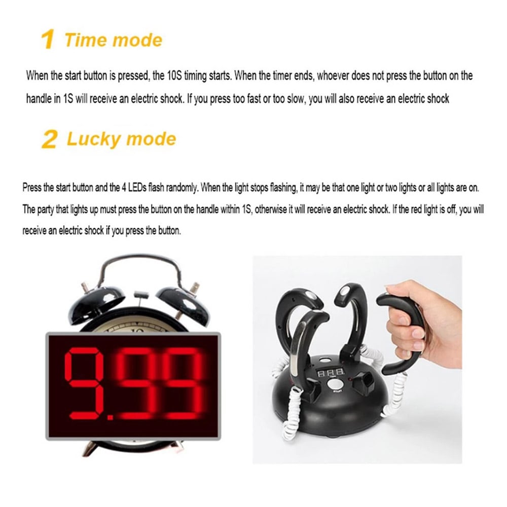Παιχνίδι αντανακλαστικών για 2-4 παίκτες με ηλεκτρικό σοκ και LED για μικρούς και μεγάλους! Ιδανικό για πάρτι στο σπίτι, παρέες και για τολμηρούς. Το τέλειο παιχνίδι για να “σοκάρει” τη διάθεση και να φέρει ατελείωτο γέλιο. Τέλειο και για παιδικά πάρτι.