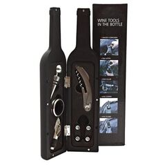 Σετ αξεσουάρ σερβιρίσματος κρασιού σε πρωτότυπη θήκη - μπουκάλι. Σετ εργαλείων κρασιού τοποθετημένα έξυπνα σε ένα "μπουκάλι κρασιού". Περιλαμβάνονται ανοιχτήρι με τιρμπουσόν, στόμιο ροής με πώμα, πώμα, δαχτυλίδι σερβιρίσματος, κόφτης για την ταινία ασφαλείας.