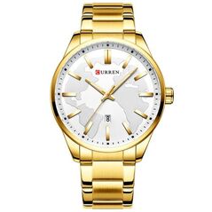 Ανδρικό αδιάβροχο ρολόι Curren με χρυσό μπρασελέ από ανοξείδωτο ατσάλι, μεταλλική χρυσή κάσα και λευκό καντράν με χρυσές λεπτομέρειες.