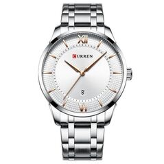Ανδρικό αδιάβροχο ρολόι Curren με ασημί μπρασελέ από ανοξείδωτο ατσάλι, μεταλλική κάσα και λευκό καντράν με ασημί λεπτομέρειες.