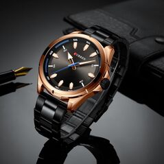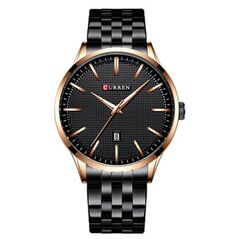 Ανδρικό αδιάβροχο ρολόι Curren με μαύρο μπρασελέ από ανοξείδωτο ατσάλι, μεταλλική ροζ-χρυσή κάσα και μαύρο καντράν με ροζ-χρυσές λεπτομέρειες και ένδειξη ημερομηνίας.