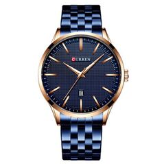 Ανδρικό αδιάβροχο ρολόι Curren με μπλε μπρασελέ από ανοξείδωτο ατσάλι, μεταλλική ροζ-χρυσή κάσα και μπλε καντράν με ροζ-χρυσές λεπτομέρειες και ένδειξη ημερομηνίας.
