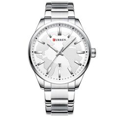 Ανδρικό αδιάβροχο ρολόι Curren με ασημί μπρασελέ από ανοξείδωτο ατσάλι, μεταλλική ασημί κάσα και λευκό καντράν διακοσμημένο με ανάγλυφο σχέδιο, ασημί λεπτομέρειες και ένδειξη ημερομηνίας.