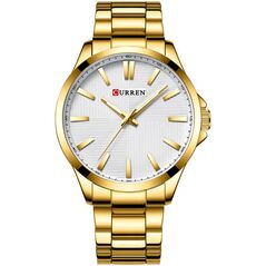 Ανδρικό αδιάβροχο ρολόι Curren με χρυσό μπρασελέ από ανοξείδωτο ατσάλι, μεταλλική χρυσή κάσα και λευκό καντράν διακοσμημένο με ανάγλυφο σχέδιο, χρυσές λεπτομέρειες και ένδειξη ημερομηνίας.