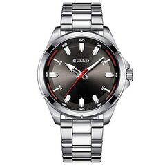Ανδρικό αδιάβροχο ρολόι Curren με ασημί μπρασελέ από ανοξείδωτο ατσάλι, μεταλλική ασημί κάσα και μαύρο καντράν με κόκκινες λεπτομέρειες.