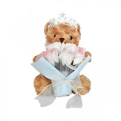 Διάφανο κουτί δώρου με αρκουδάκι και ανθοδέσμη, ύψους 28cm. Έτοιμο για προσφορά, με κομψή διάφανη συσκευασία και ρομαντική αισθητική. Ιδανικό για επετείους, γενέθλια και ιδιαίτερες στιγμές.